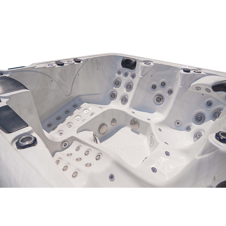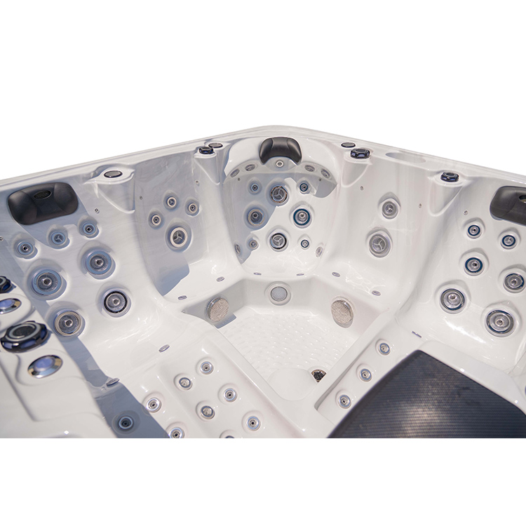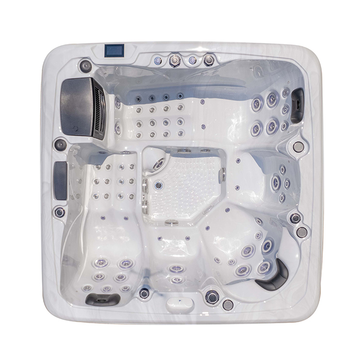 JW-2207 This is an outdoor acrylic massage bathtub measuring 2.1m * 2.1m, which comes with 3 seats and 2 lounges and can accommodate up to five people. It is equipped with massage jets, fountains, waterfalls and other functions. You can adjust them according to your needs through the control panel on the bathtub, and enjoy other massage experiences while taking a bath.