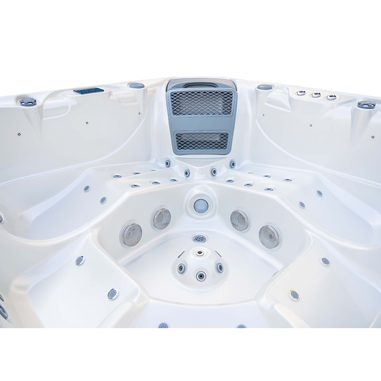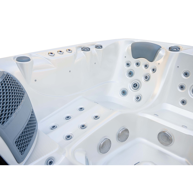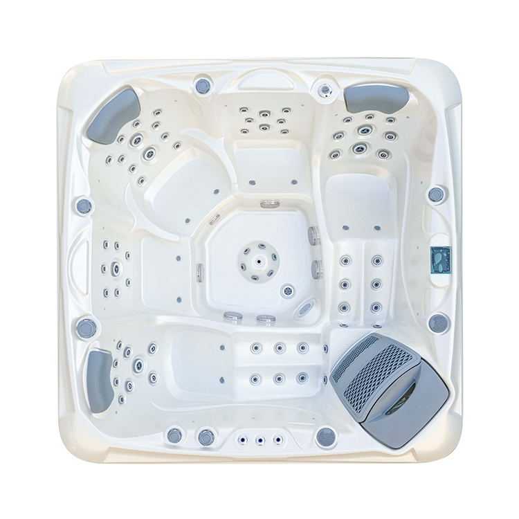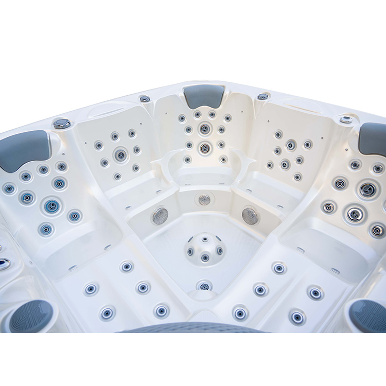 JW-2210 This is an outdoor acrylic massage bathtub measuring 2.2m * 2.2m, which comes with 3 seats and 2 lounges and can accommodate up to five people. It is equipped with massage jets, fountains, waterfalls and other functions. You can adjust them according to your needs through the control panel on the bathtub, and enjoy other massage experiences while taking a bath.