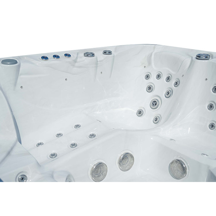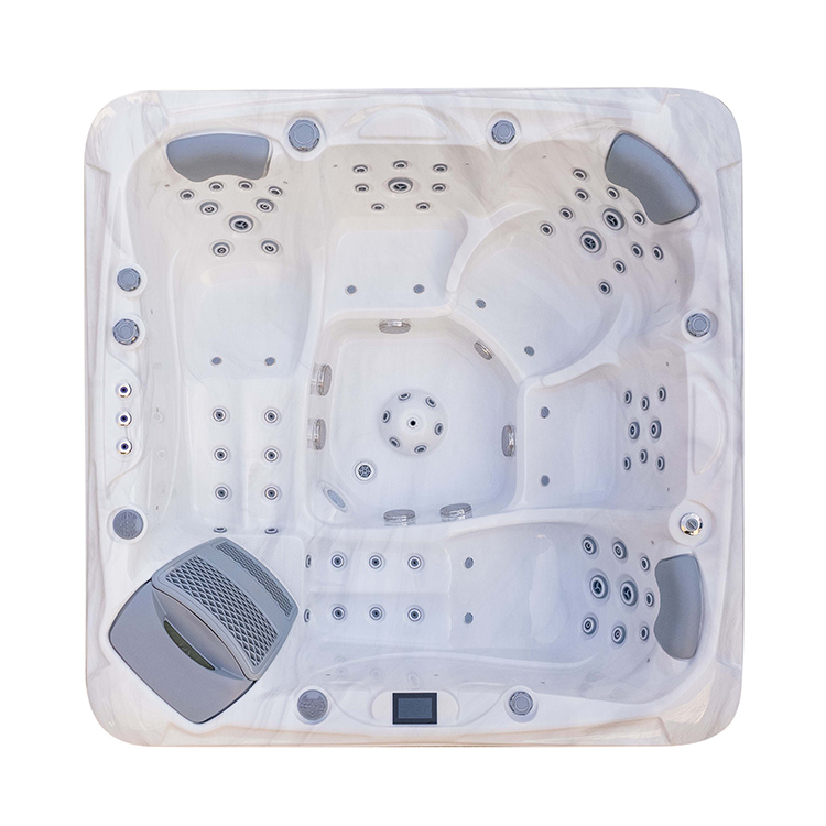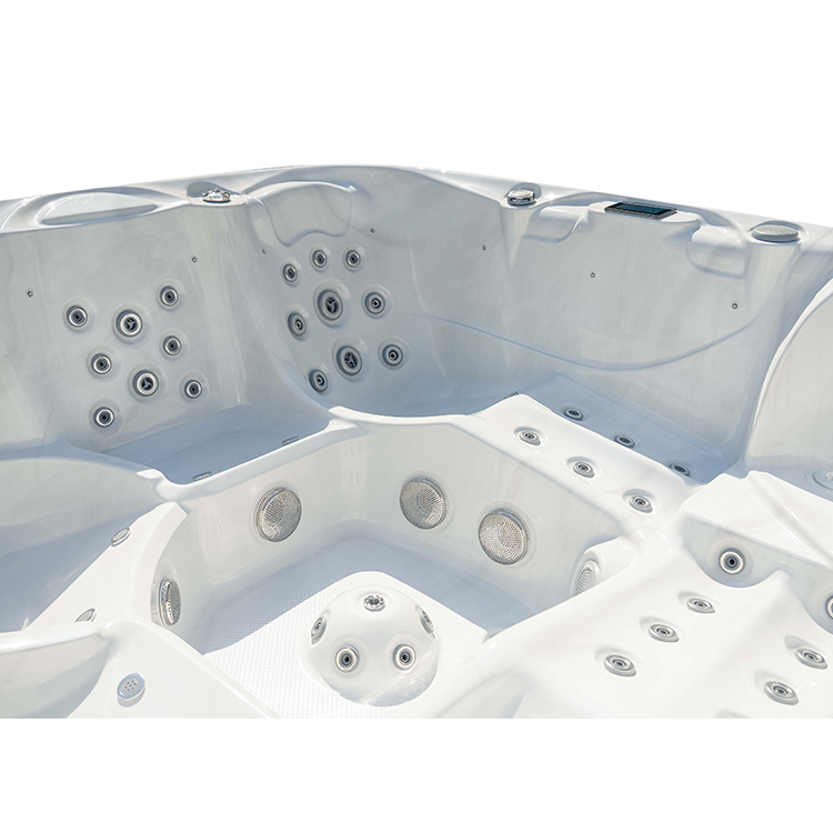 JW-2210 This is an outdoor acrylic massage bathtub measuring 2.2m * 2.2m, which comes with 3 seats and 2 lounges and can accommodate up to five people. It is equipped with massage jets, fountains, waterfalls and other functions. You can adjust them according to your needs through the control panel on the bathtub, and enjoy other massage experiences while taking a bath.